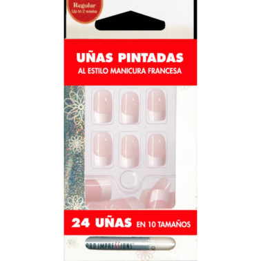 Uñas estilo francesa color rosa claro, contiene 24 uñas en 10 tamaños y un bote de pegamento de 2gr.